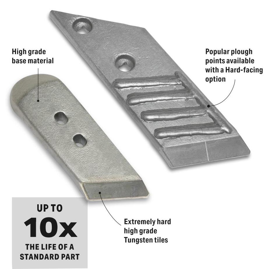 Spaldings offer a wide range of popular parts with a Tungsten Carbide option. Our most popular plough points are also available with a Hardfacing option behind the Tungsten Carbide to further increase working life.